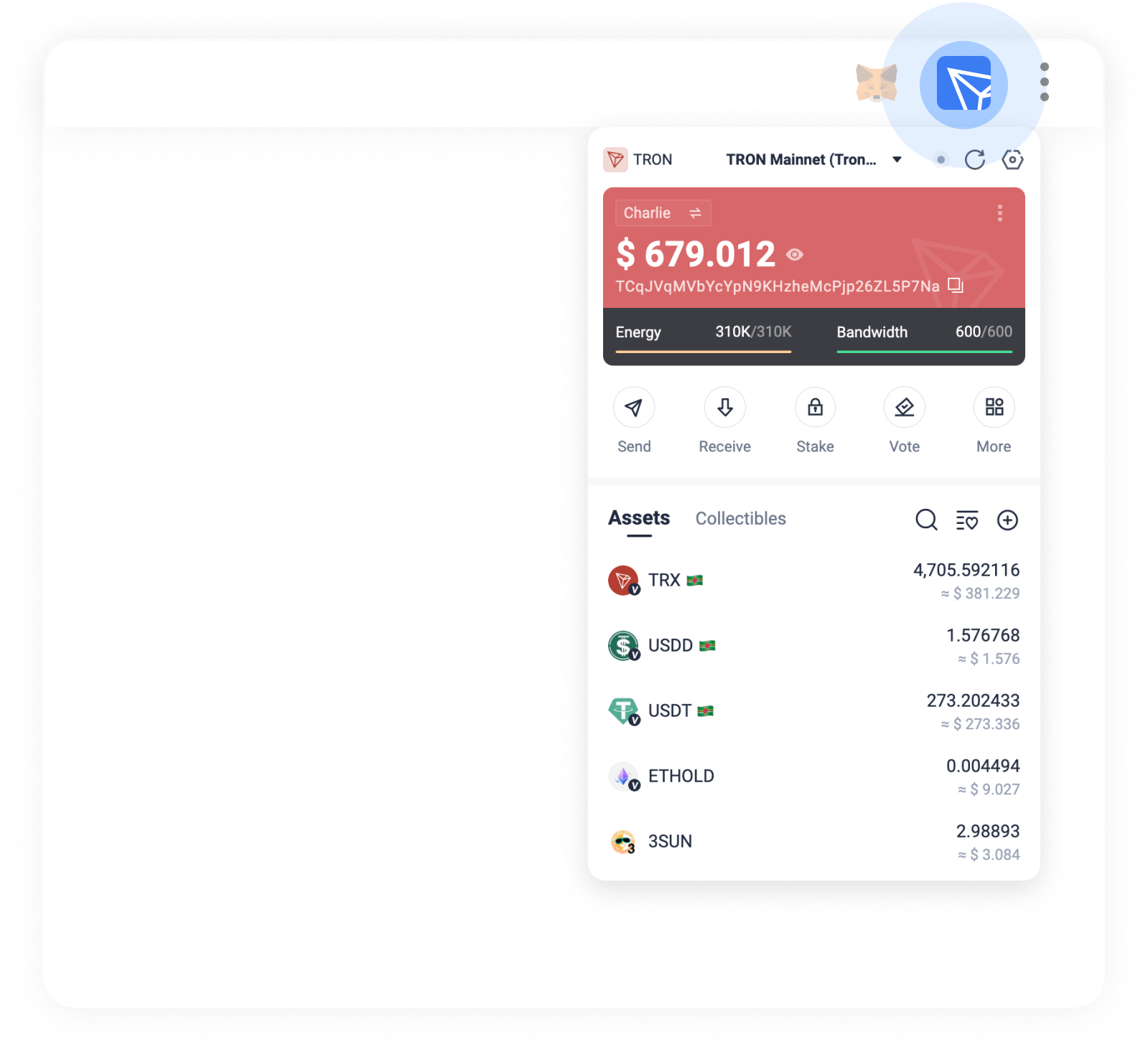 Deep support for the TRON network: we support TRX, TRC-10, TRC-20, and TRC-721 tokens as well as unique staking mechanisms for you to obtain or delegate resources.